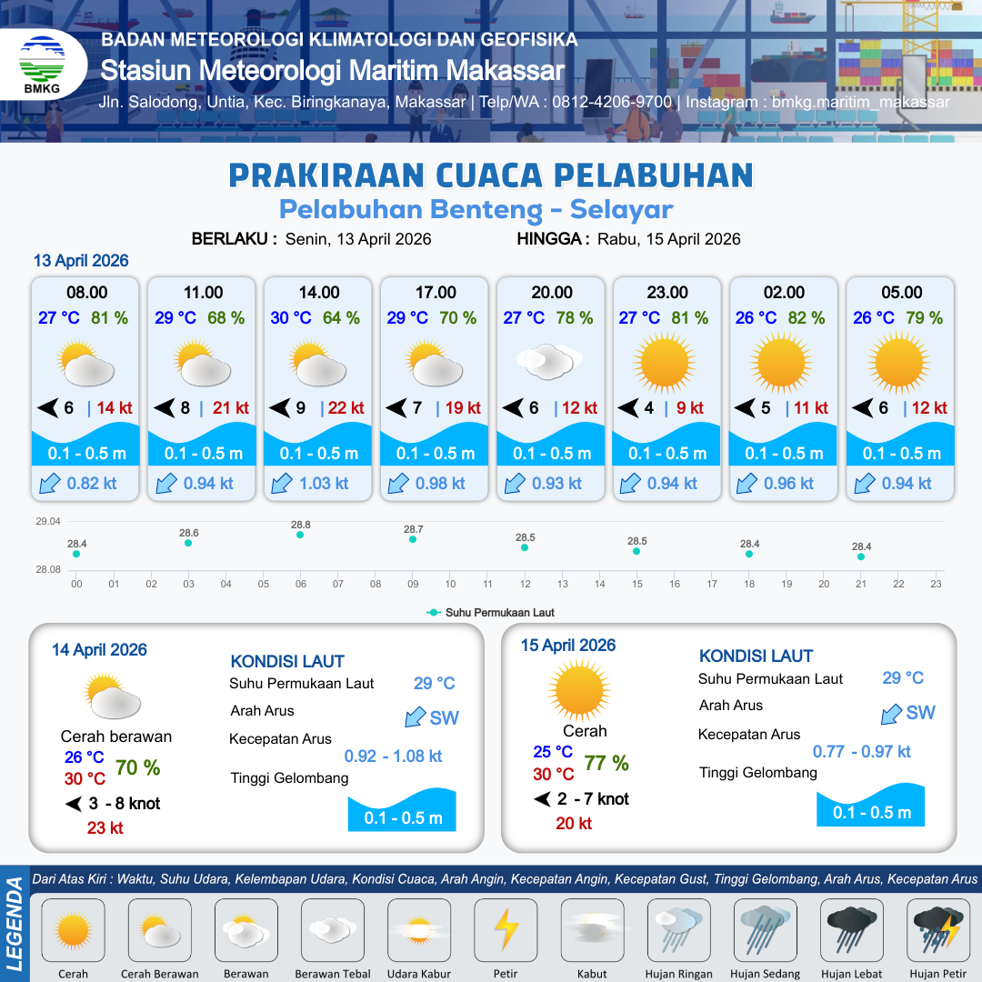13 Apr 26, 15.00 15 jam kedepan | Timur 4 kt Gust Peningkatan kecepatan angin yang singkat dan tiba-tiba : 9 kt | 0.3 m Tenang | Barat Daya 0.9 Knot | 10 km | 27 °C | 81 % | +0.64 m | |