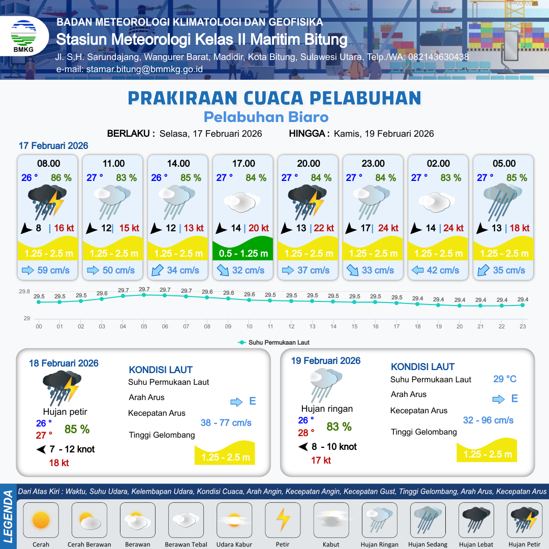 17 Feb 26, 21.00 2 jam kedepan | Hujan Sedang | Timur Laut 13 kt Gust Peningkatan kecepatan angin yang singkat dan tiba-tiba : 18 kt | | | 10 km | 27 °C | 85 % | +0.15 m |