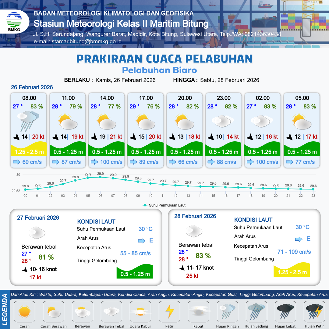 26 Feb 26, 03.00 15 jam yang lalu | Cerah Berawan | Barat Laut 14 kt Gust Peningkatan kecepatan angin yang singkat dan tiba-tiba : 19 kt | | | 9 km | 28 °C | 79 % | +0.26 m |