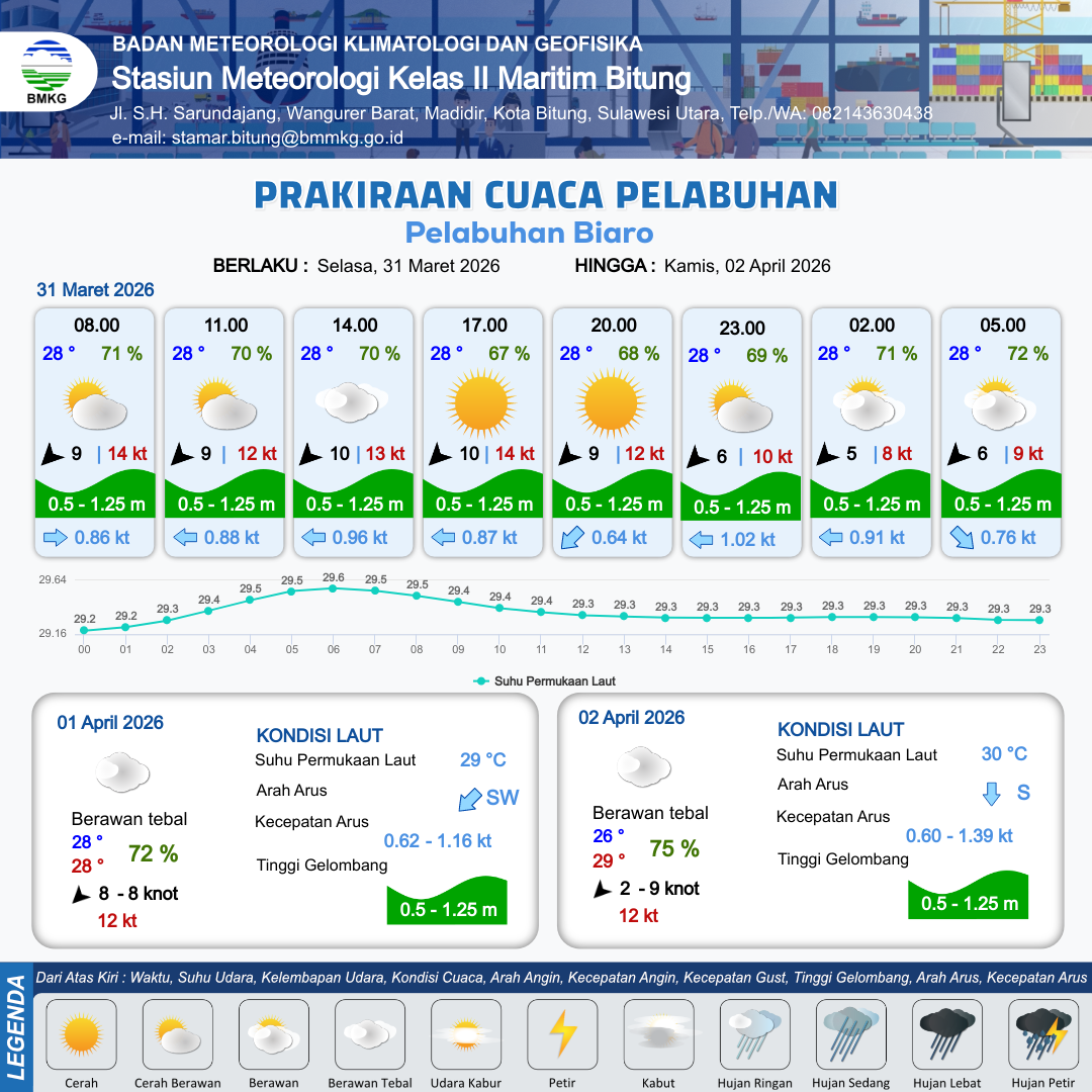 31 Mar 26, 08.00 12 jam yang lalu | Cerah Berawan | Timur Laut 10 kt Gust Peningkatan kecepatan angin yang singkat dan tiba-tiba : 14 kt | | | 10 km | 28 °C | 67 % | +0.40 m |