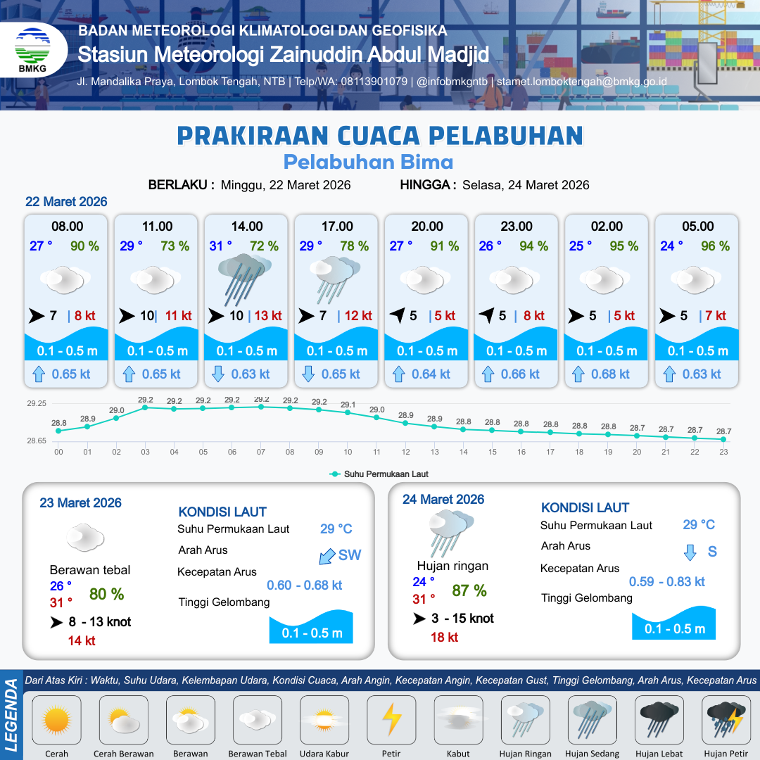 22 Mar 26, 03.00 16 jam yang lalu | Berawan Tebal | Barat 10 kt Gust Peningkatan kecepatan angin yang singkat dan tiba-tiba : 11 kt | | | 7 km | 29 °C | 73 % | -0.15 m |