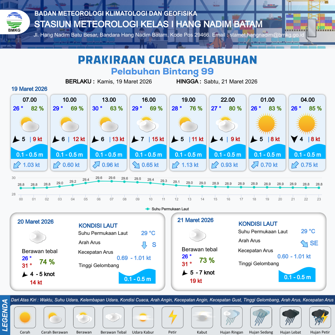 19 Mar 26, 10.00 3 jam kedepan | Timur Laut 7 kt Gust Peningkatan kecepatan angin yang singkat dan tiba-tiba : 14 kt | 0.1 m Tenang | Selatan 0.8 Knot | 10 km | 29 °C | 69 % | -1.03 m | |