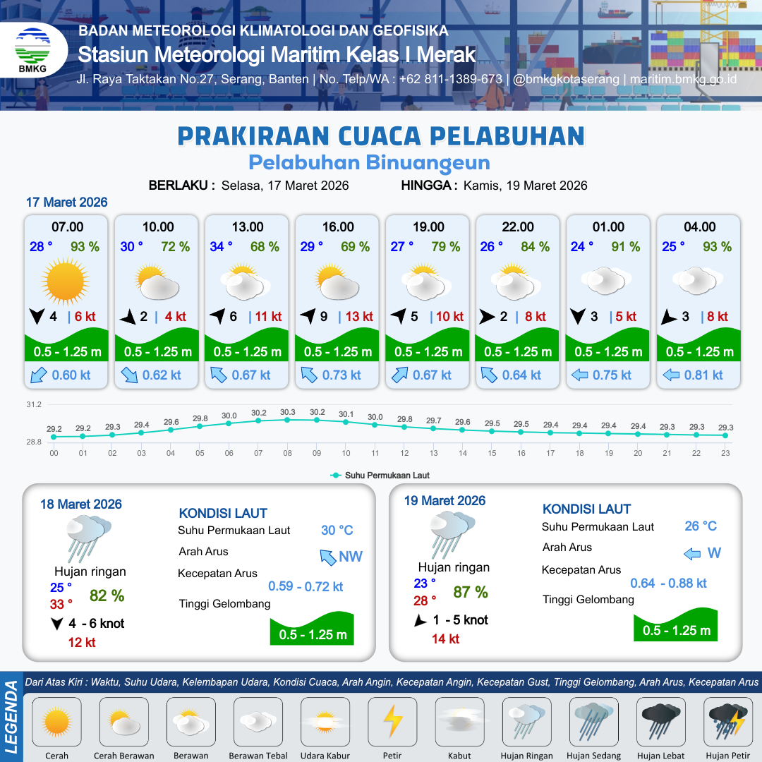 17 Mar 26, 14.00 12 jam kedepan | Barat 2 kt Gust Peningkatan kecepatan angin yang singkat dan tiba-tiba : 8 kt | 1.1 m Rendah | Timur Laut 0.7 Knot | 10 km | 26 °C | 82 % | +0.19 m | |