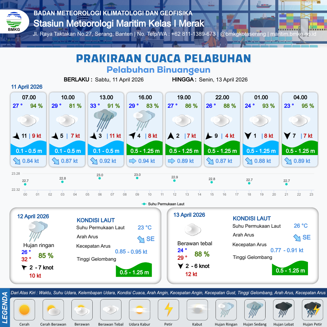 11 Apr 26, 14.00 Saat ini | Timur Laut 9 kt Gust Peningkatan kecepatan angin yang singkat dan tiba-tiba : 7 kt | 0.6 m Rendah | Tenggara 0.9 Knot | 10 km | 27 °C | 86 % | +0.43 m | |