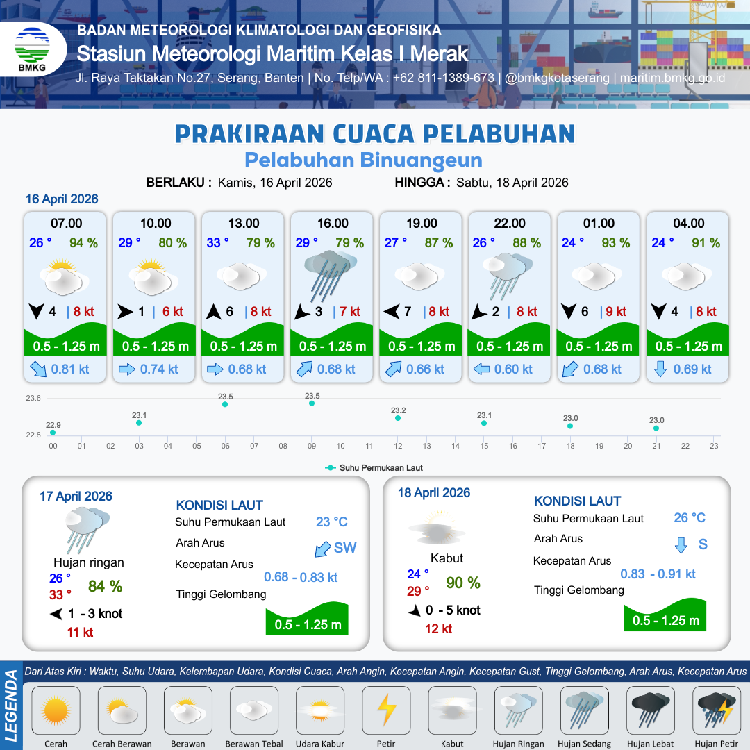 16 Apr 26, 23.00 4 jam kedepan | Berawan Tebal | Utara 1 kt Gust Peningkatan kecepatan angin yang singkat dan tiba-tiba : 9 kt | | | 10 km | 25 °C | 91 % | +0.42 m |