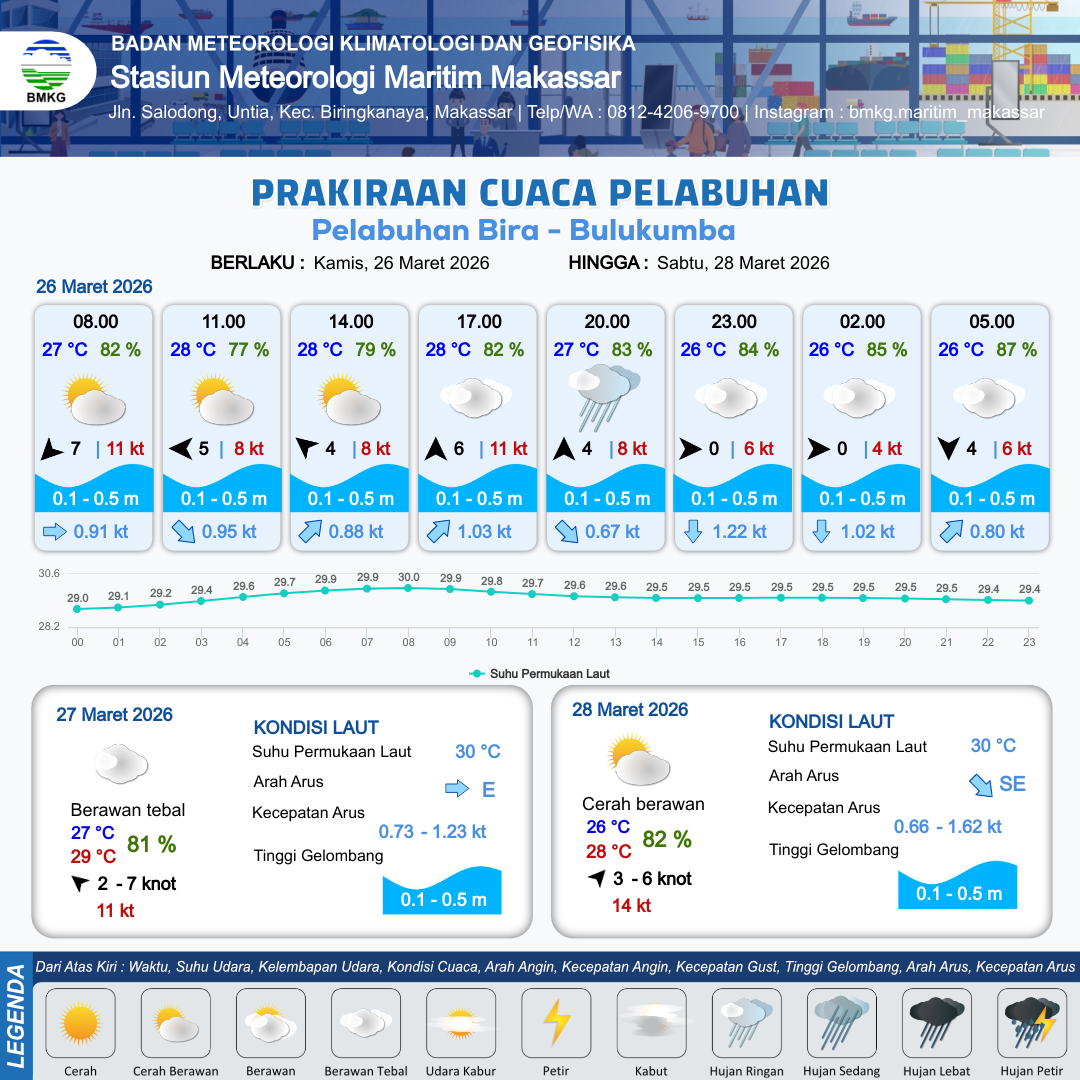 26 Mar 26, 04.00 3 jam kedepan | Timur 5 kt Gust Peningkatan kecepatan angin yang singkat dan tiba-tiba : 8 kt | 0.1 m Tenang | Tenggara 0.9 Knot | 10 km | 28 °C | 78 % | -0.17 m | |
