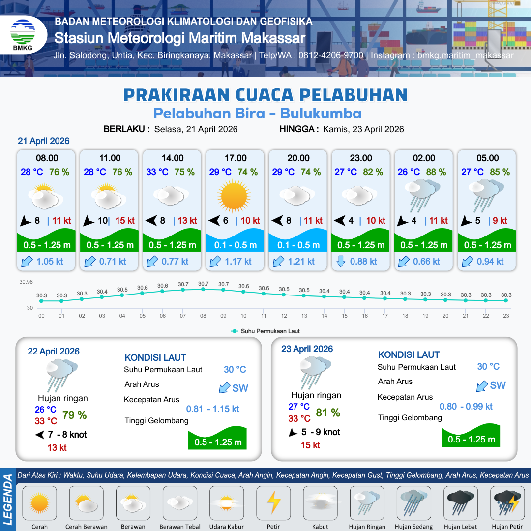 21 Apr 26, 09.00 22 jam kedepan | Timur 6 kt Gust Peningkatan kecepatan angin yang singkat dan tiba-tiba : 9 kt | 0.3 m Tenang | Barat Daya 1.0 Knot | 10 km | 28 °C | 76 % | +0.60 m | |