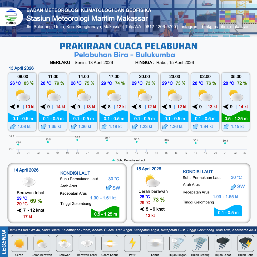 13 Apr 26, 12.00 6 jam kedepan | Timur 8 kt Gust Peningkatan kecepatan angin yang singkat dan tiba-tiba : 12 kt | 0.5 m Rendah | Barat Daya 1.2 Knot | 10 km | 29 °C | 73 % | +0.67 m | |