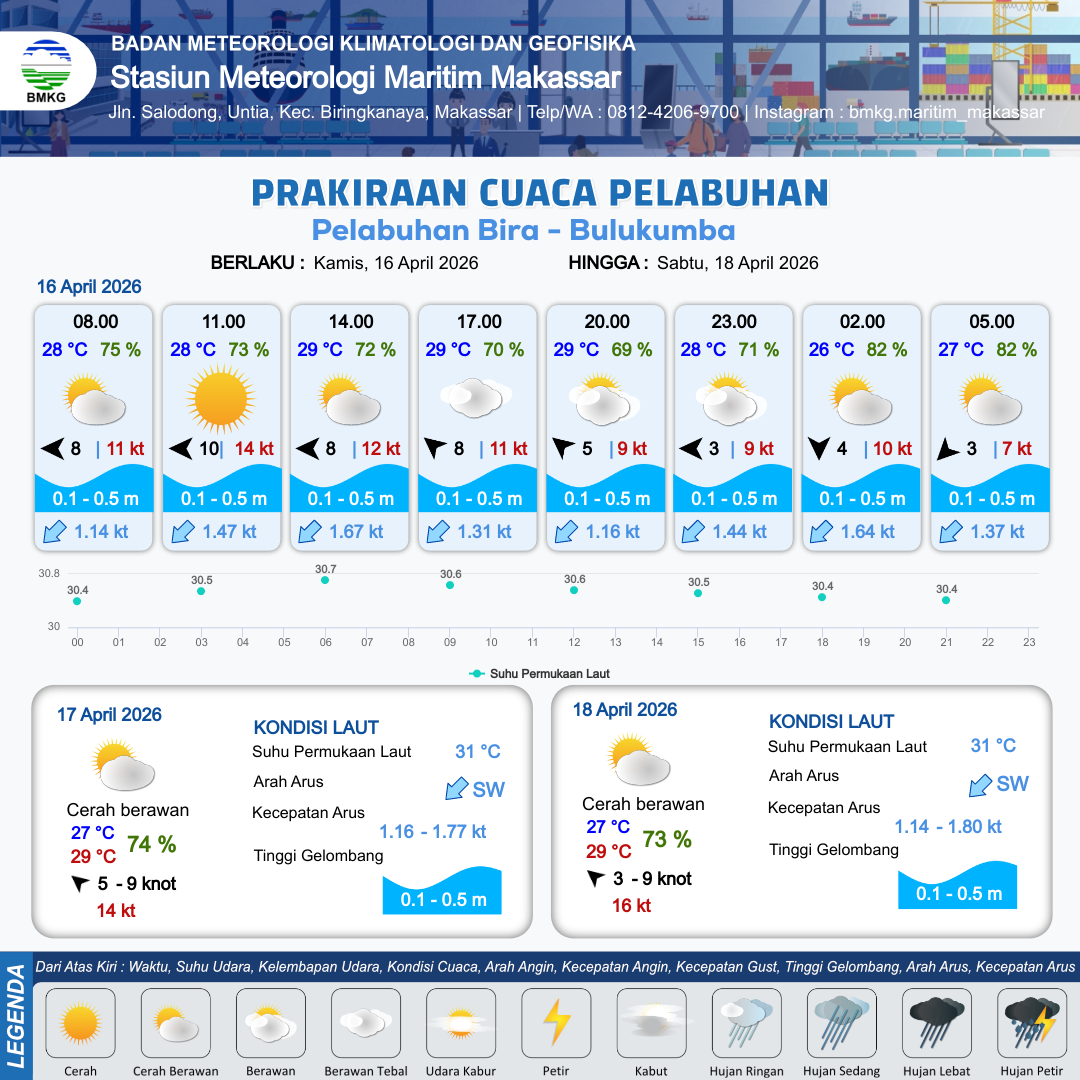 16 Apr 26, 23.00 10 jam kedepan | Timur 5 kt Gust Peningkatan kecepatan angin yang singkat dan tiba-tiba : 7 kt | 0.3 m Tenang | Barat Daya 1.2 Knot | 7 km | 27 °C | 81 % | +0.63 m |