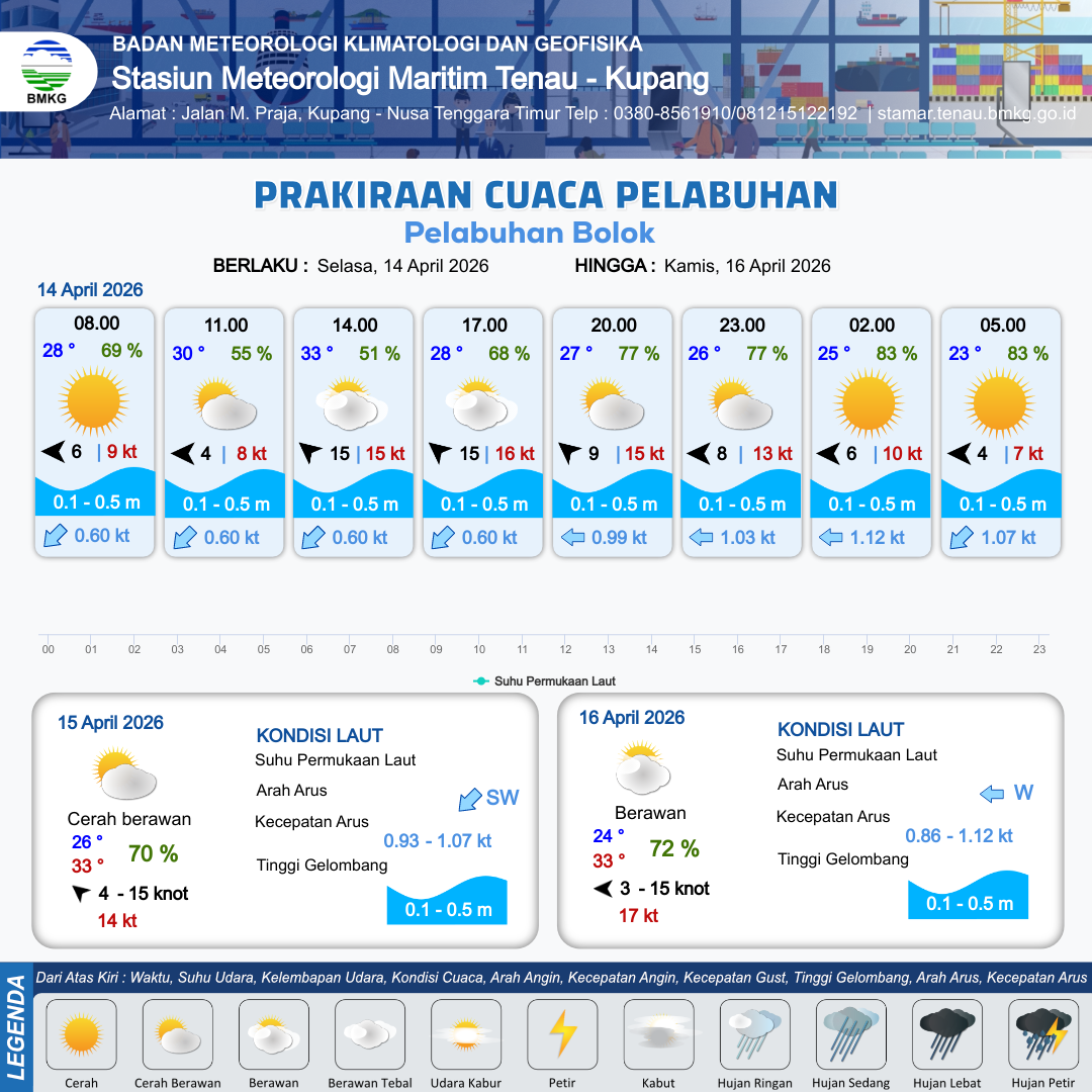 14 Apr 26, 06.00 3 jam kedepan | Tenggara 15 kt Gust Peningkatan kecepatan angin yang singkat dan tiba-tiba : 15 kt | 0.3 m Tenang | Barat Daya 0.6 Knot | 10 km | 33 °C | 51 % | +0.50 m | |