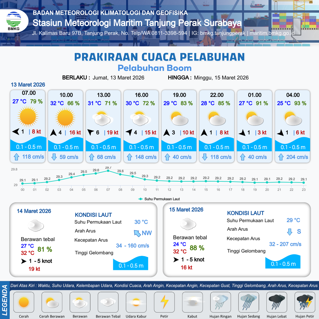 13 Mar 26, 11.00 7 jam kedepan | Selatan 3 kt Gust Peningkatan kecepatan angin yang singkat dan tiba-tiba : 7 kt | 0.3 m Tenang | Utara 89.0 cm/s | 10 km | 29 °C | 79 % | +0.40 m | |