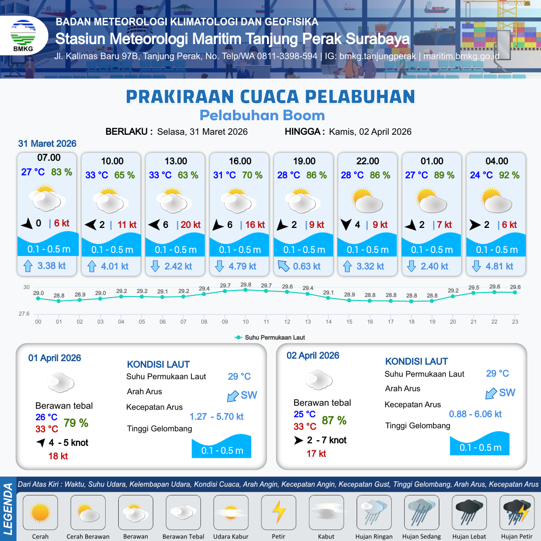 31 Mar 26, 09.00 2 jam kedepan | Timur Laut 6 kt Gust Peningkatan kecepatan angin yang singkat dan tiba-tiba : 16 kt | 0.2 m Tenang | Selatan 4.8 Knot | 10 km | 31 °C | 70 % | -0.64 m | |