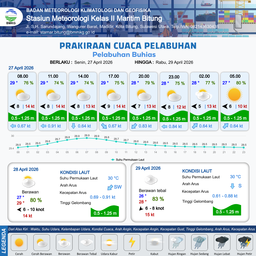 27 Apr 26, 11.00 2 jam kedepan | Timur 7 kt Gust Peningkatan kecepatan angin yang singkat dan tiba-tiba : 13 kt | 1 m Rendah | Barat Daya 0.8 Knot | 10 km | 28 °C | 78 % | -0.28 m | |
