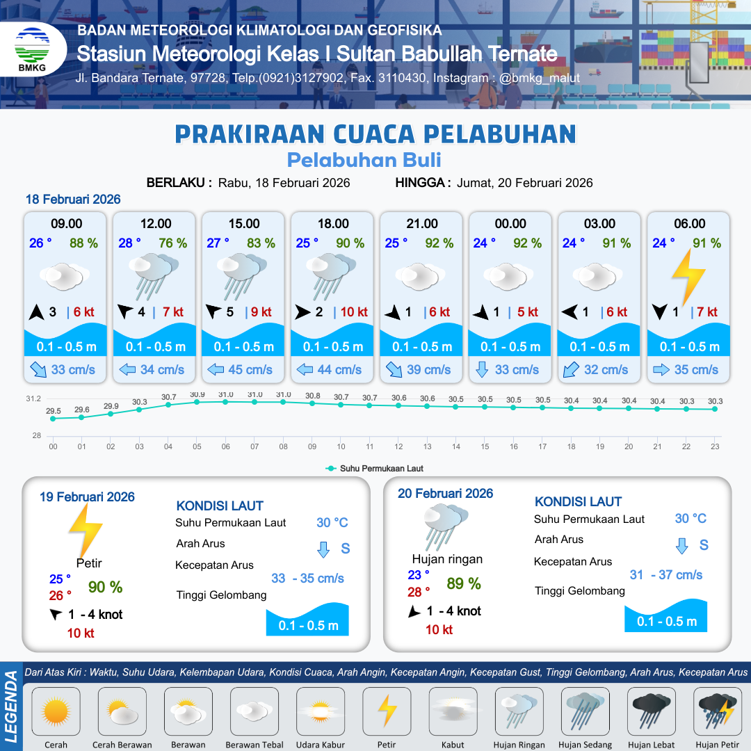 18 Feb 26, 22.00 4 jam kedepan | Petir | Utara 1 kt Gust Peningkatan kecepatan angin yang singkat dan tiba-tiba : 5 kt | | | 10 km | 24 °C | 92 % | +0.45 m |