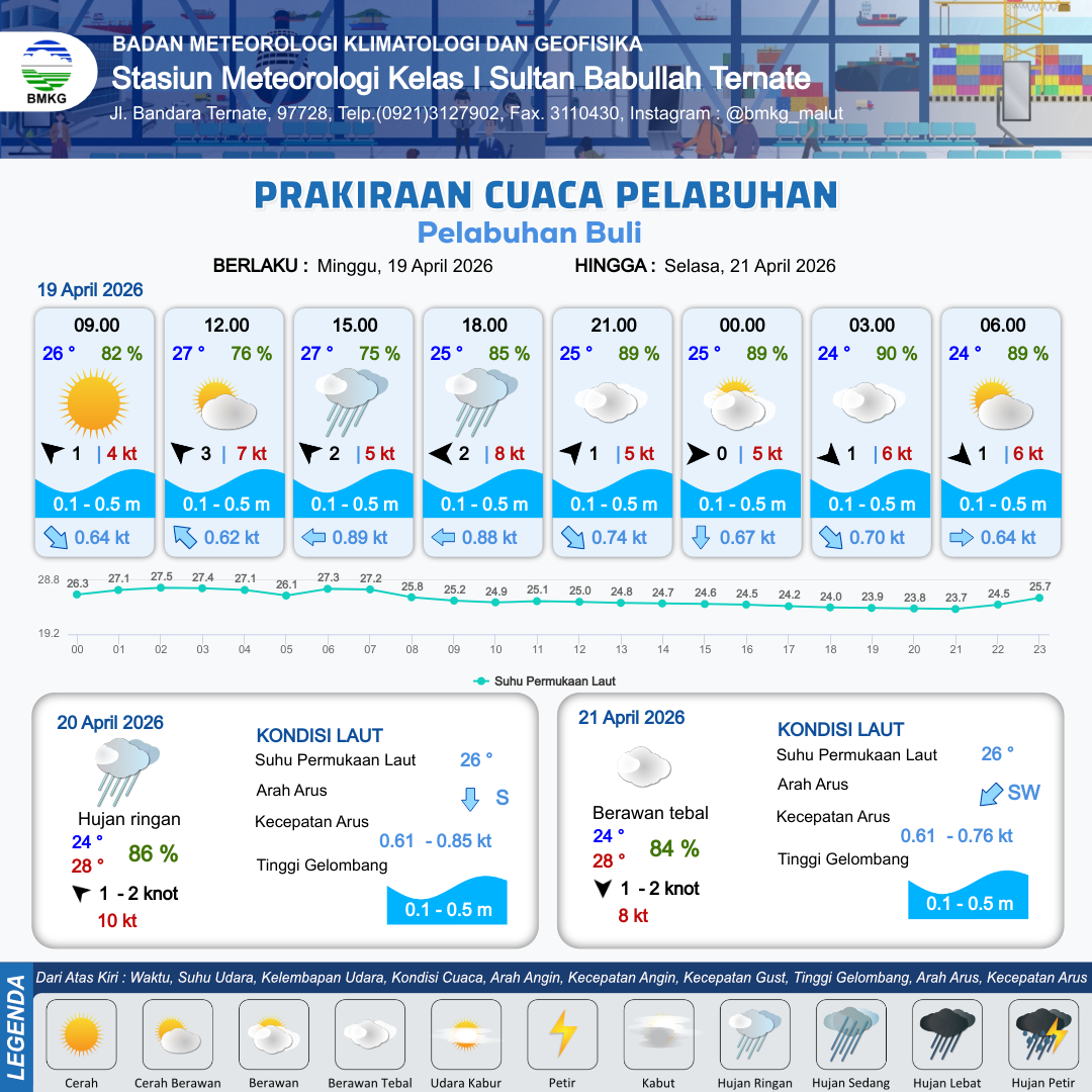18 Apr 26, 12.00 7 jam yang lalu | Cerah Berawan | Barat 1 kt Gust Peningkatan kecepatan angin yang singkat dan tiba-tiba : 7 kt | | | 10 km | 25 °C | 91 % | +0.66 m |