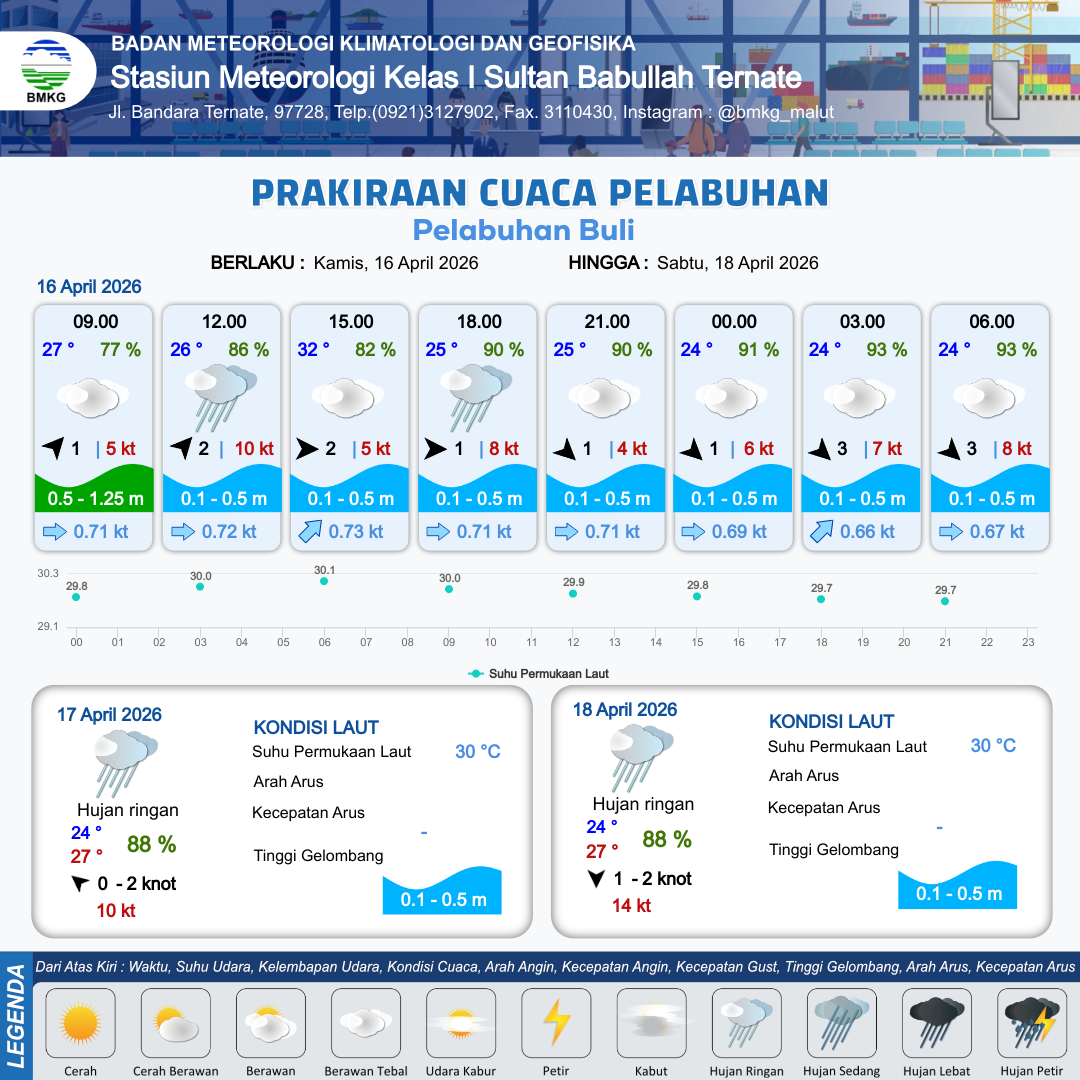 16 Apr 26, 08.00 10 jam yang lalu | Hujan Ringan | Barat 1 kt Gust Peningkatan kecepatan angin yang singkat dan tiba-tiba : 7 kt | | | 10 km | 27 °C | 89 % | +0.63 m |