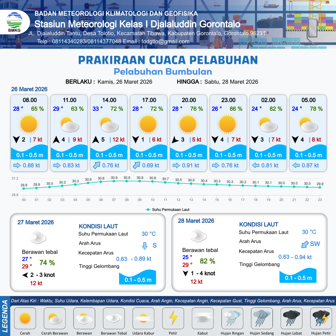 26 Mar 26, 20.00 3 jam kedepan | Cerah Berawan | Utara 4 kt Gust Peningkatan kecepatan angin yang singkat dan tiba-tiba : 7 kt | | | 10 km | 25 °C | 78 % | -0.14 m |