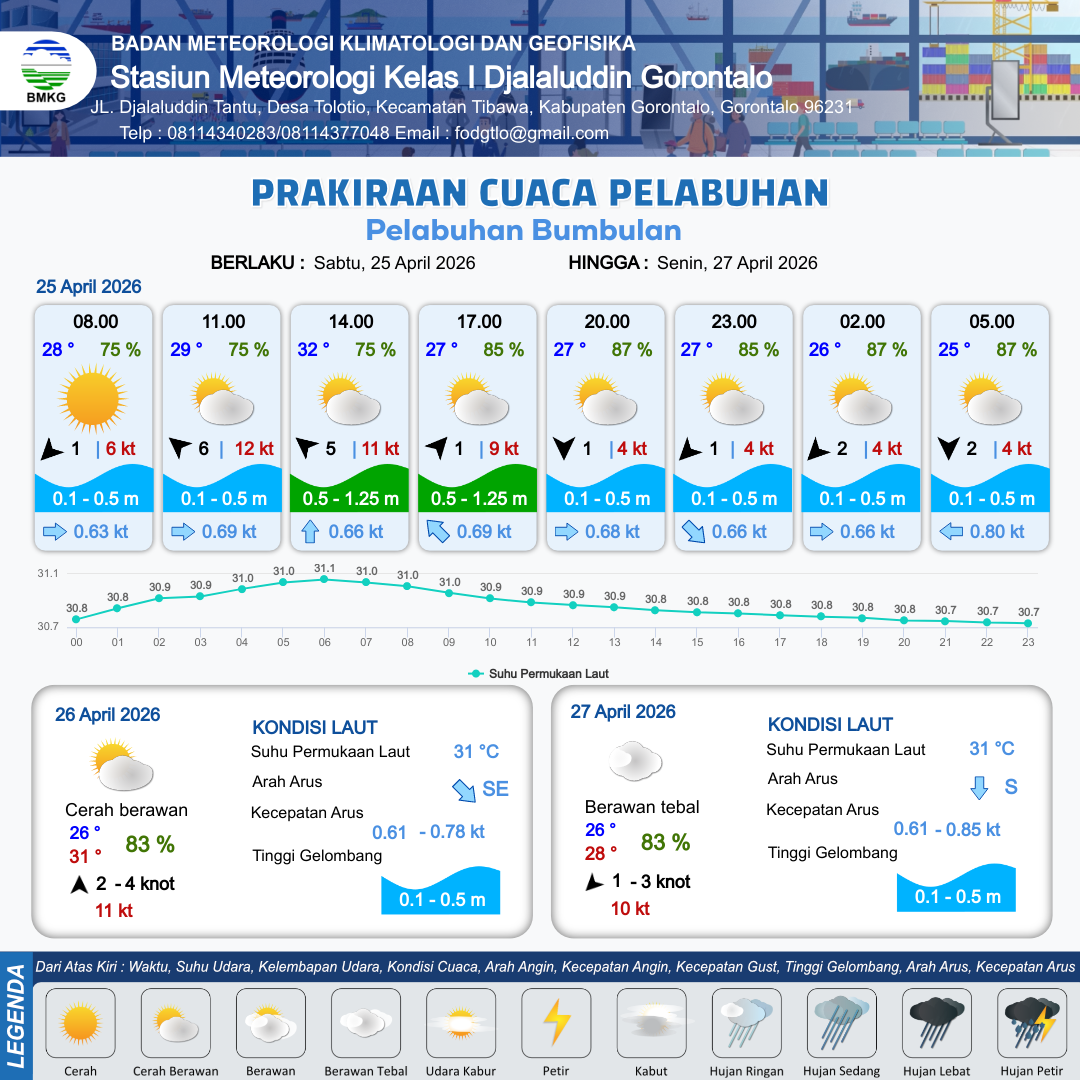 23 Apr 26, 05.00 16 jam kedepan | Tenggara 5 kt Gust Peningkatan kecepatan angin yang singkat dan tiba-tiba : 9 kt | 0.4 m Tenang | Timur Laut 0.6 Knot | 10 km | 31 °C | 77 % | -0.25 m | |