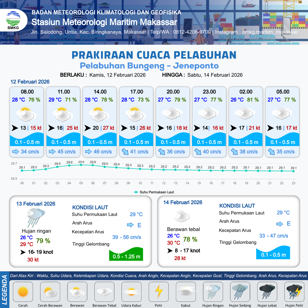 12 Feb 26, 20.00 3 jam kedepan | Barat 16 kt Gust Peningkatan kecepatan angin yang singkat dan tiba-tiba : 18 kt | 0.2 m Tenang | Tenggara 35.0 cm/s | 10 km | 27 °C | 77 % | -0.60 m | |