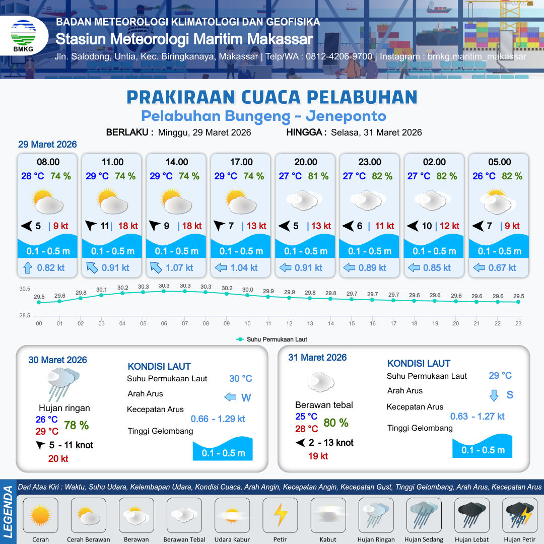 29 Mar 26, 12.00 4 jam kedepan | Timur 5 kt Gust Peningkatan kecepatan angin yang singkat dan tiba-tiba : 13 kt | 0.2 m Tenang | Barat 0.9 Knot | 10 km | 27 °C | 81 % | +0.46 m | |