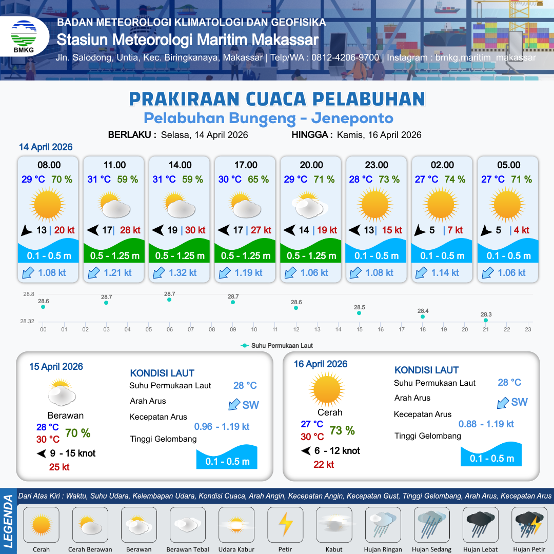 14 Apr 26, 23.00 15 jam kedepan | Timur 9 kt Gust Peningkatan kecepatan angin yang singkat dan tiba-tiba : 10 kt | 0.4 m Tenang | Barat Daya 1.0 Knot | 10 km | 28 °C | 72 % | +0.62 m |