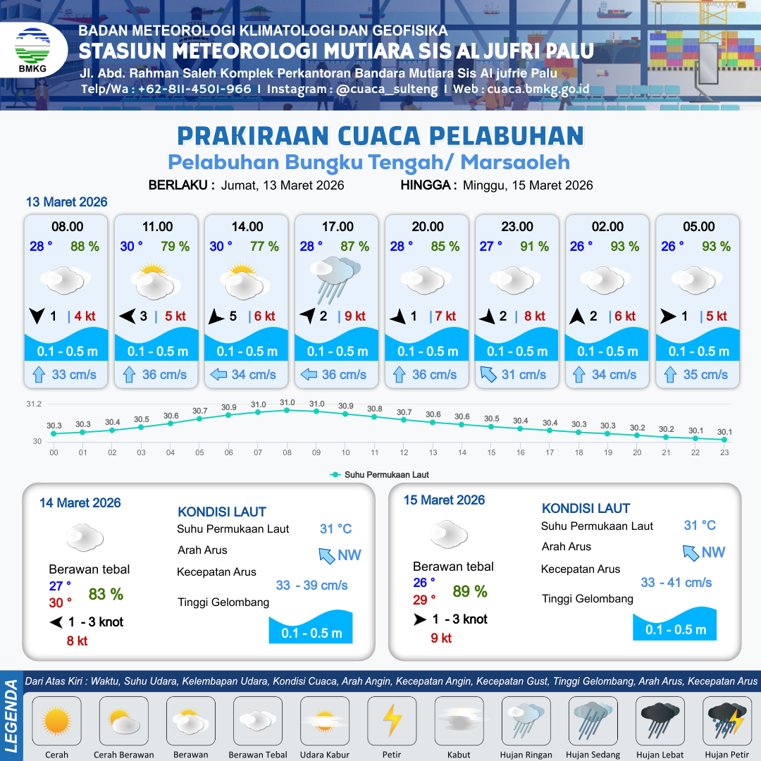 13 Mar 26, 06.00 12 jam yang lalu | Berawan | Timur Laut 5 kt Gust Peningkatan kecepatan angin yang singkat dan tiba-tiba : 6 kt | | | 10 km | 30 °C | 77 % | +0.15 m |
