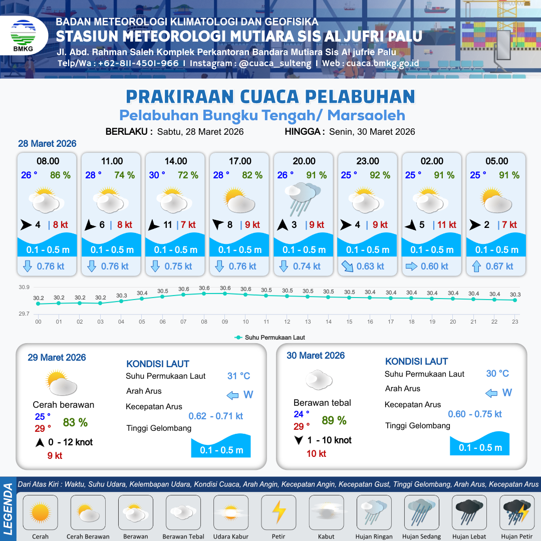 29 Mar 26, 05.00 6 jam kedepan | Timur 3 kt Gust Peningkatan kecepatan angin yang singkat dan tiba-tiba : 9 kt | 0.3 m Tenang | Selatan 0.7 Knot | 10 km | 27 °C | 80 % | +0.34 m | |