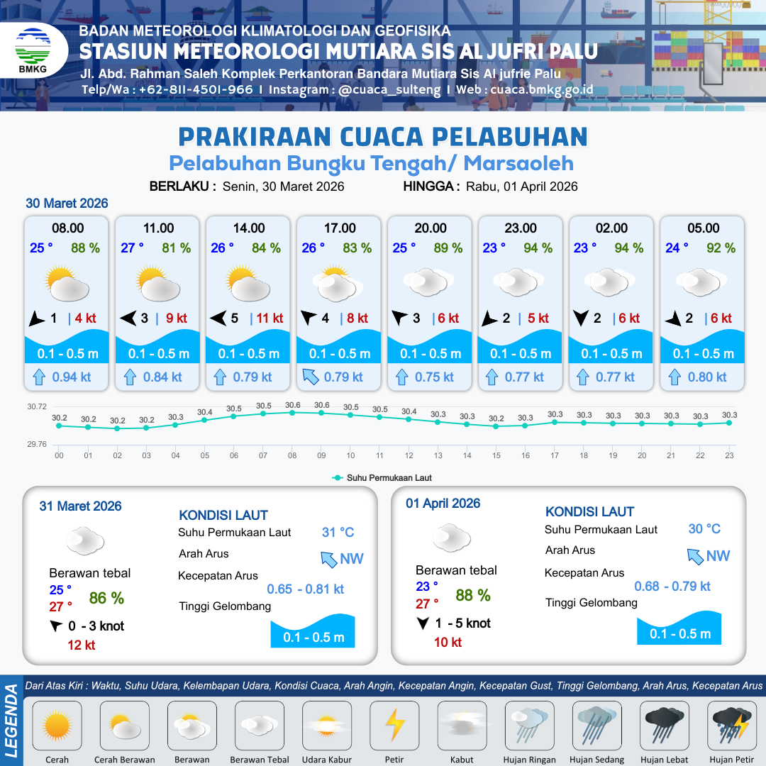 30 Mar 26, 23.00 7 jam kedepan | Timur 0 kt Gust Peningkatan kecepatan angin yang singkat dan tiba-tiba : 4 kt | 0.3 m Tenang | Utara 0.8 Knot | 9 km | 25 °C | 91 % | -0.60 m |
