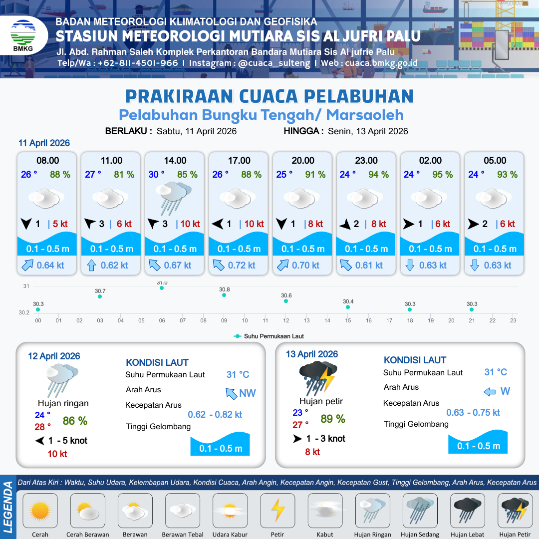 11 Apr 26, 21.00 9 jam kedepan | Barat 2 kt Gust Peningkatan kecepatan angin yang singkat dan tiba-tiba : 5 kt | 0.3 m Tenang | Selatan 0.6 Knot | 10 km | 24 °C | 93 % | +0.70 m | |