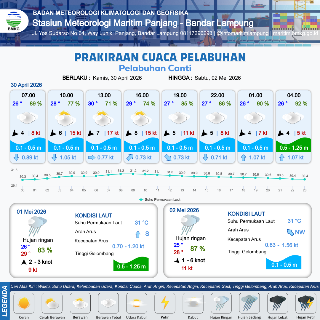 28 Apr 26, 22.00 4 jam kedepan | Berawan Tebal | Timur Laut 4 kt Gust Peningkatan kecepatan angin yang singkat dan tiba-tiba : 8 kt | | | 10 km | 26 °C | 92 % | -0.04 m |