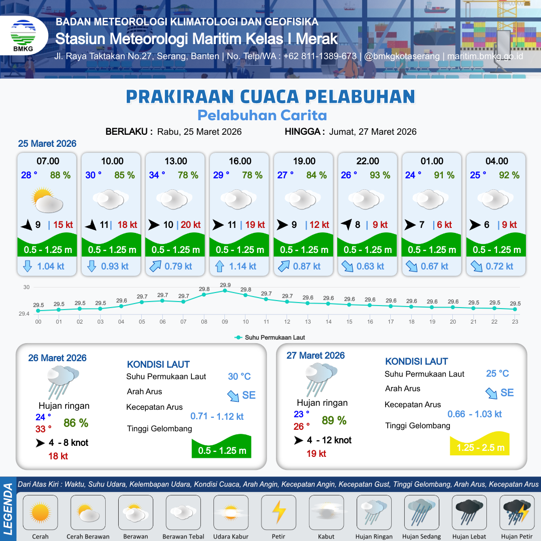 25 Mar 26, 11.00 6 jam kedepan | Barat 9 kt Gust Peningkatan kecepatan angin yang singkat dan tiba-tiba : 16 kt | 1 m Rendah | Utara 1.0 Knot | 10 km | 27 °C | 84 % | -0.41 m | |