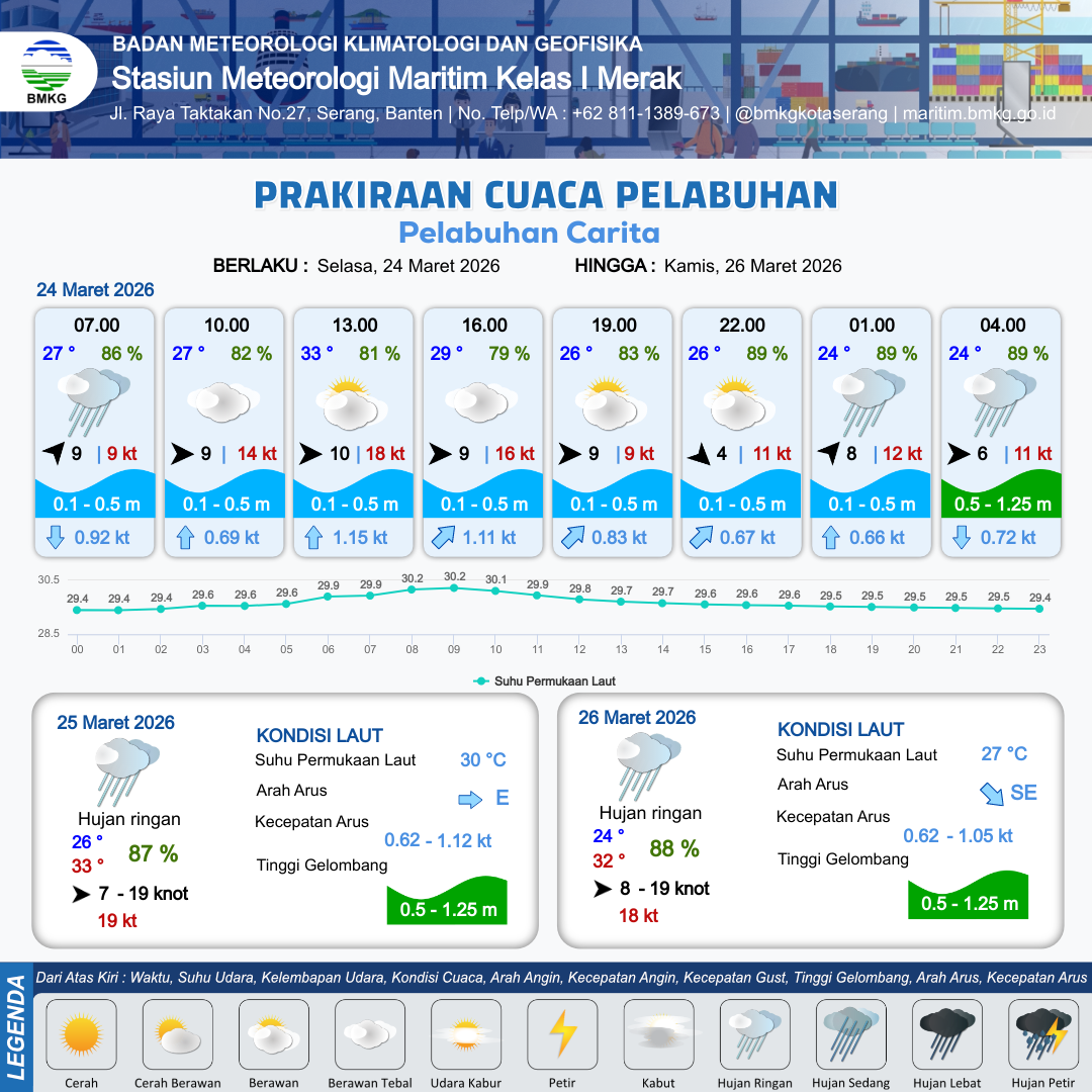 23 Mar 26, 17.00 3 jam yang lalu | Berawan | Barat Daya 9 kt Gust Peningkatan kecepatan angin yang singkat dan tiba-tiba : 3 kt | | | 10 km | 25 °C | 83 % | -0.11 m |