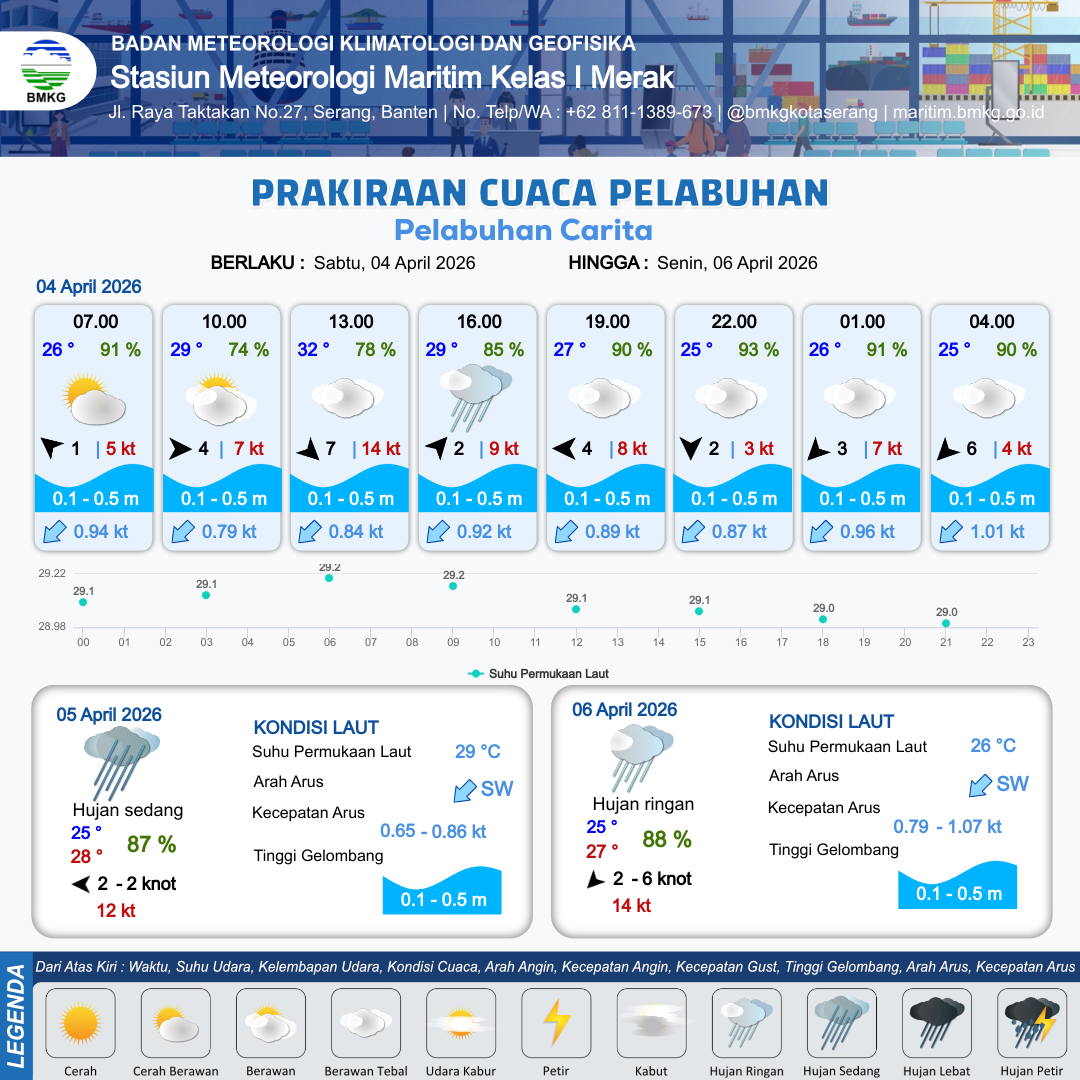 4 Apr 26, 09.00 6 jam kedepan | Barat Daya 2 kt Gust Peningkatan kecepatan angin yang singkat dan tiba-tiba : 9 kt | 0.4 m Tenang | Barat Daya 0.9 Knot | 10 km | 29 °C | 85 % | +0.49 m | |