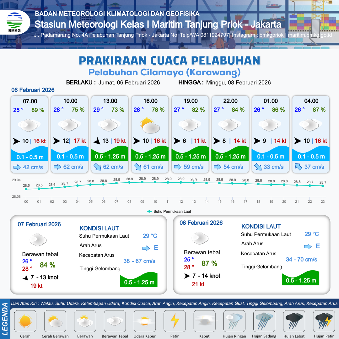 6 Feb 26, 04.00 3 jam kedepan | Barat 12 kt Gust Peningkatan kecepatan angin yang singkat dan tiba-tiba : 17 kt | 0.5 m Rendah | Timur 61.0 cm/s | 10 km | 29 °C | 72 % | -0.18 m | |