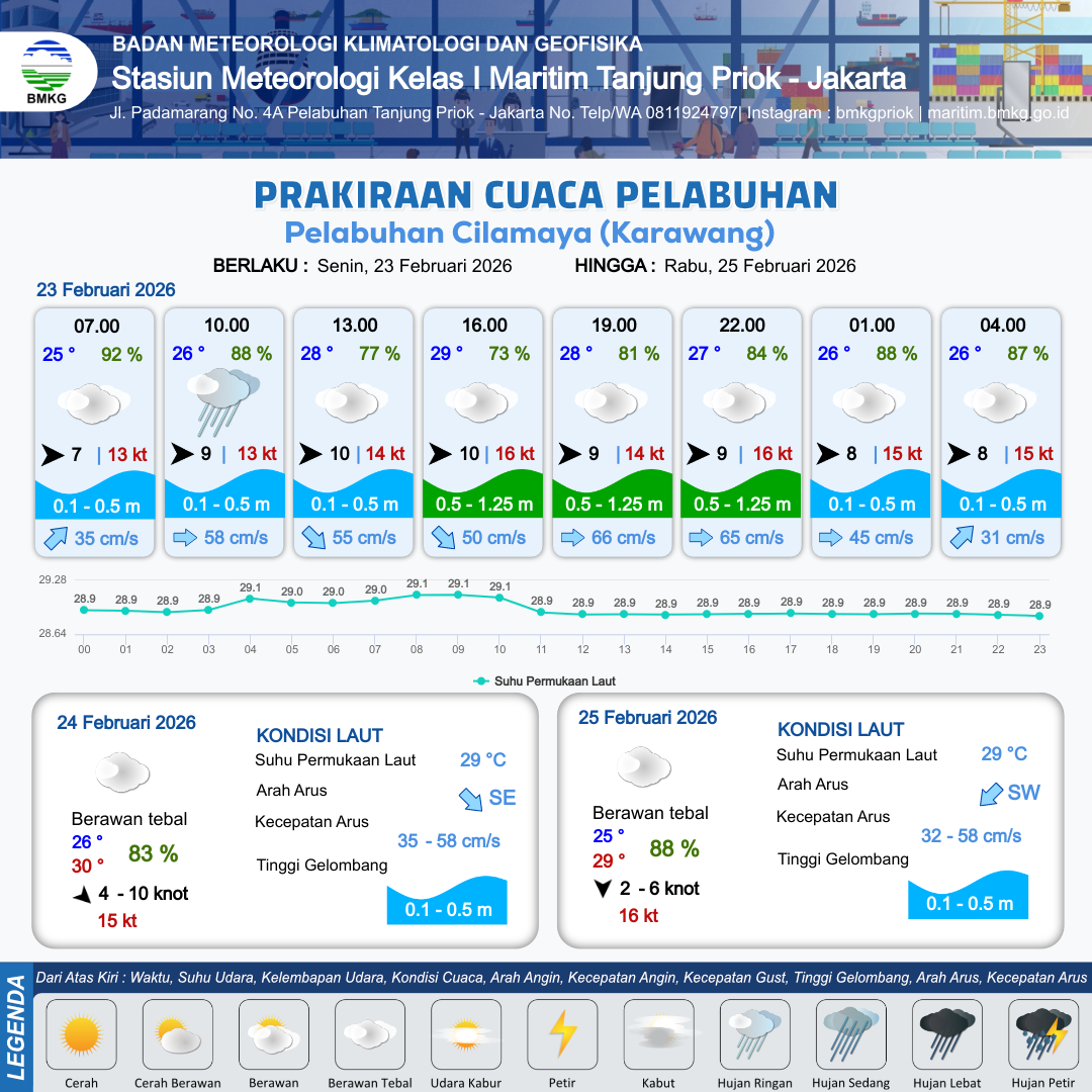 23 Feb 26, 02.00 4 jam kedepan | Barat 9 kt Gust Peningkatan kecepatan angin yang singkat dan tiba-tiba : 15 kt | 0.3 m Tenang | Timur 50.0 cm/s | 8 km | 25 °C | 92 % | -0.38 m | |