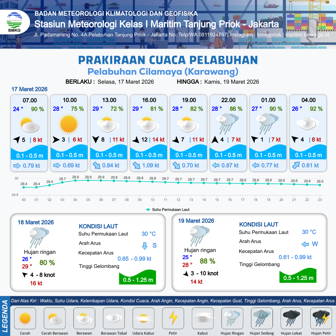 17 Mar 26, 17.00 2 jam kedepan | Tenggara 1 kt Gust Peningkatan kecepatan angin yang singkat dan tiba-tiba : 7 kt | 0.3 m Tenang | Barat 0.8 Knot | 9 km | 27 °C | 90 % | +0.29 m | |