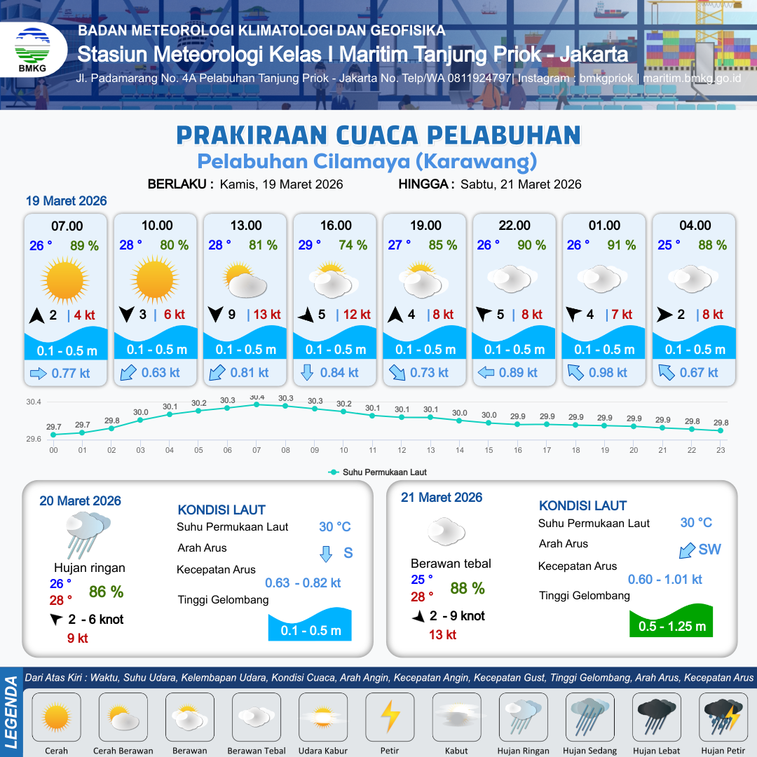 19 Mar 26, 16.00 16 jam kedepan | Tenggara 5 kt Gust Peningkatan kecepatan angin yang singkat dan tiba-tiba : 8 kt | 0.3 m Tenang | Barat 1.0 Knot | 8 km | 26 °C | 90 % | +0.42 m | |
