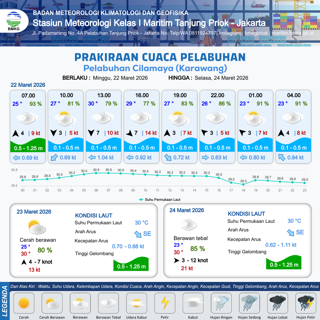 22 Mar 26, 23.00 16 jam kedepan | Tenggara 4 kt Gust Peningkatan kecepatan angin yang singkat dan tiba-tiba : 9 kt | 0.3 m Tenang | Utara 0.6 Knot | 10 km | 24 °C | 90 % | -0.10 m |