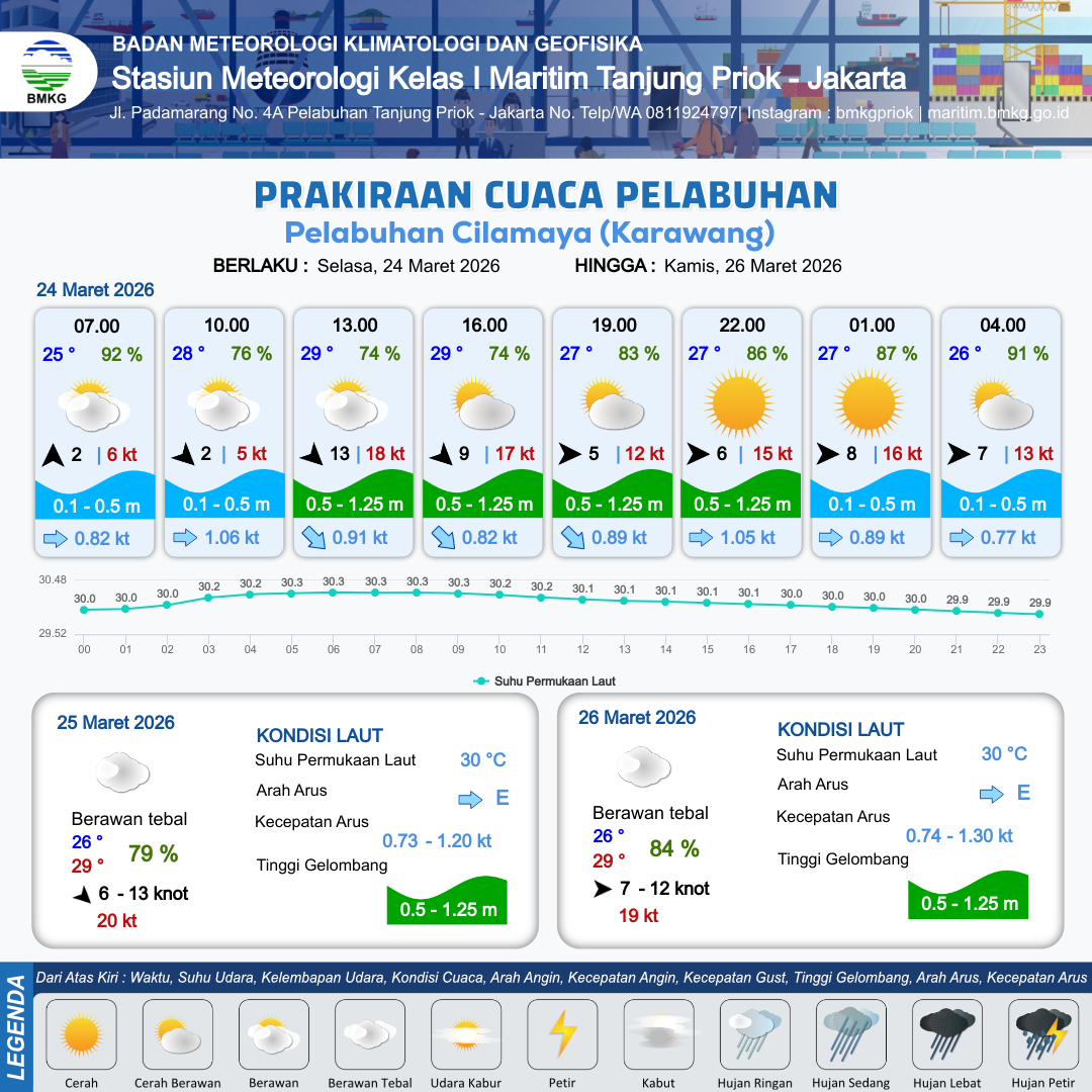 24 Mar 26, 16.00 15 jam kedepan | Barat 6 kt Gust Peningkatan kecepatan angin yang singkat dan tiba-tiba : 15 kt | 0.5 m Rendah | Timur 1.0 Knot | 8 km | 27 °C | 85 % | -0.17 m | |