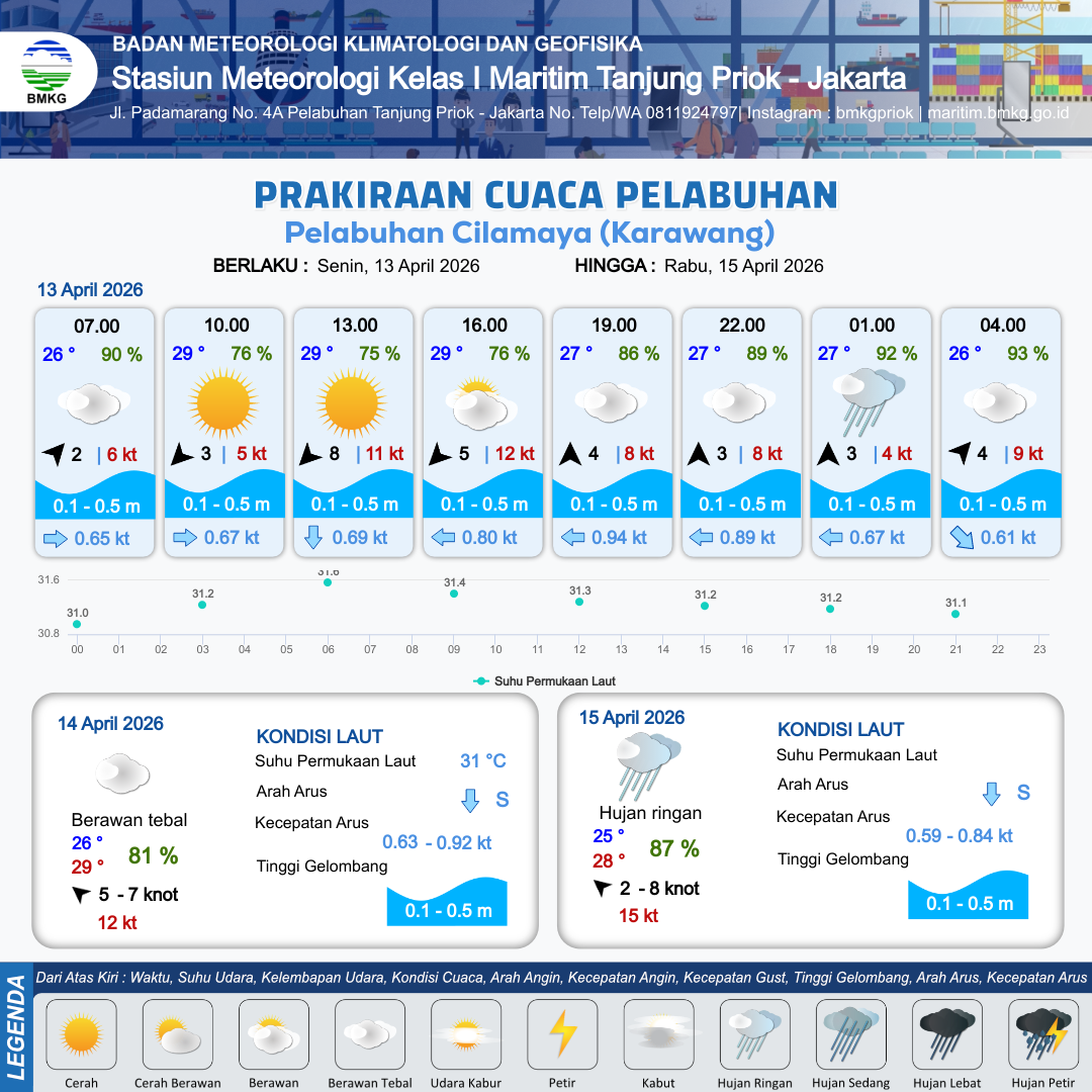 13 Apr 26, 12.00 8 jam kedepan | Selatan 4 kt Gust Peningkatan kecepatan angin yang singkat dan tiba-tiba : 8 kt | 0.3 m Tenang | Barat 0.9 Knot | 10 km | 27 °C | 86 % | +0.56 m | |