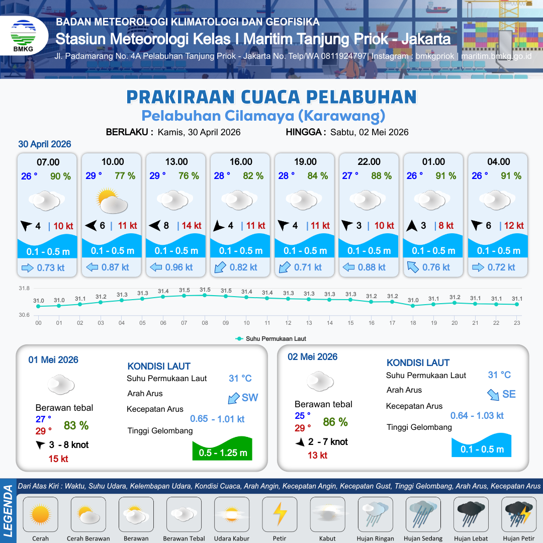 29 Apr 26, 09.00 2 jam kedepan | Timur Laut 8 kt Gust Peningkatan kecepatan angin yang singkat dan tiba-tiba : 13 kt | 0.5 m Rendah | Barat 0.8 Knot | 10 km | 30 °C | 73 % | -0.13 m | |