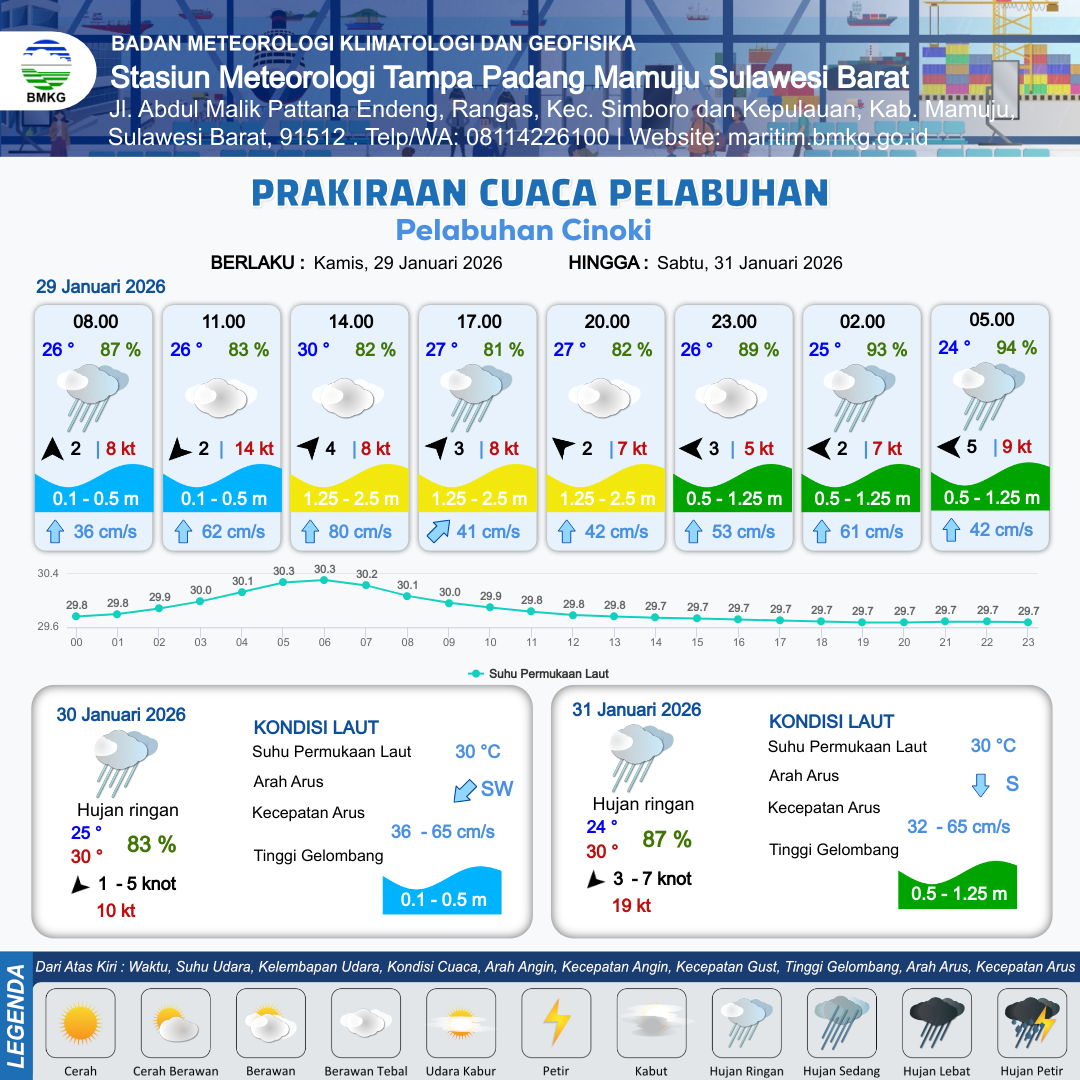29 Jan 26, 23.00 4 jam kedepan | Berawan | Barat Daya 1 kt Gust Peningkatan kecepatan angin yang singkat dan tiba-tiba : 9 kt | | | 7 km | 24 °C | 90 % | -0.05 m |