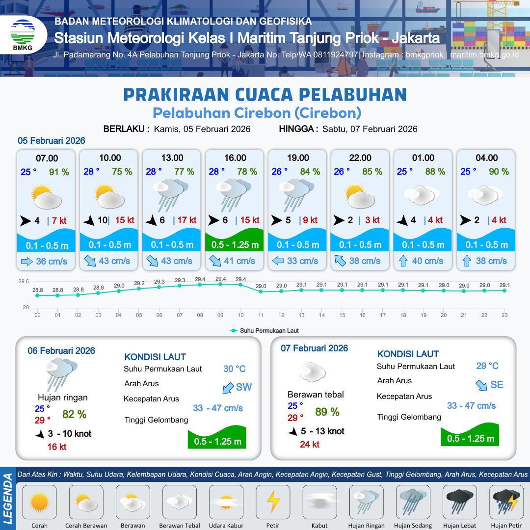 5 Feb 26, 03.00 6 jam kedepan | Barat 5 kt Gust Peningkatan kecepatan angin yang singkat dan tiba-tiba : 13 kt | 0.3 m Tenang | Tenggara 37.0 cm/s | 10 km | 29 °C | 75 % | -0.22 m | |