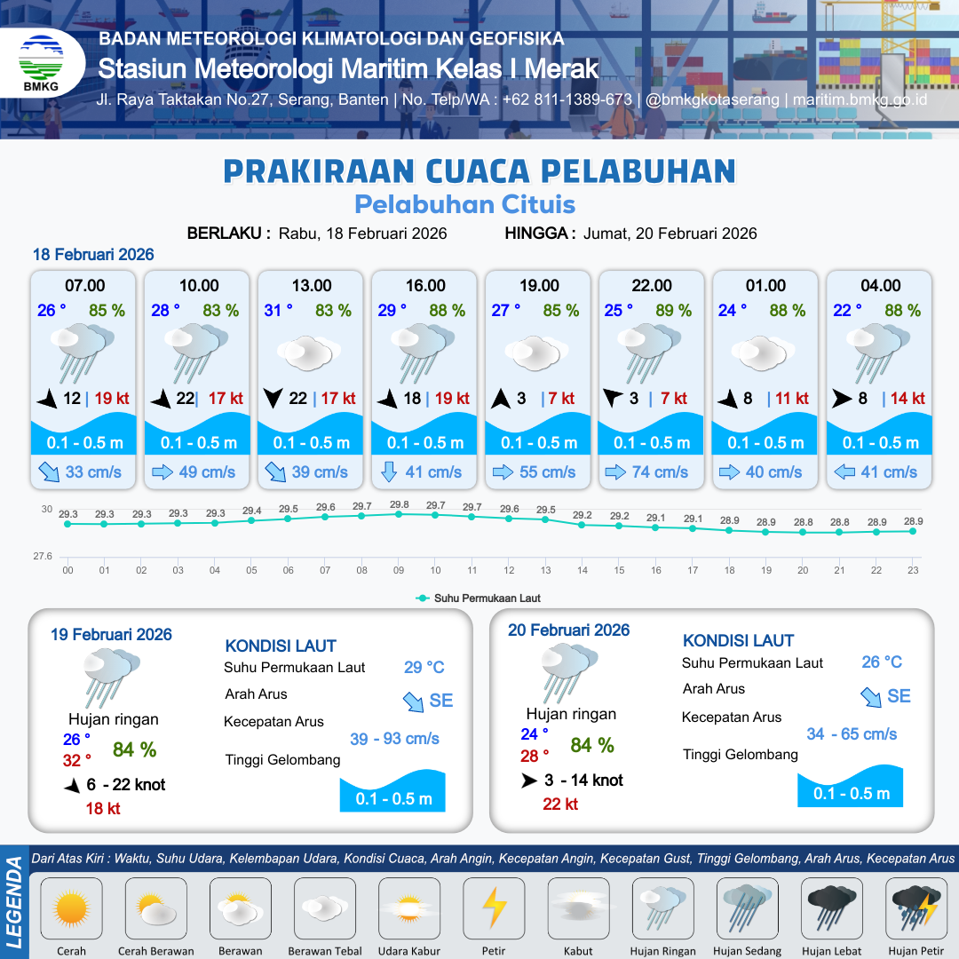 18 Feb 26, 08.00 11 jam yang lalu | Hujan Ringan | Barat Laut 18 kt Gust Peningkatan kecepatan angin yang singkat dan tiba-tiba : 15 kt | | | 10 km | 31 °C | 80 % | +0.10 m |