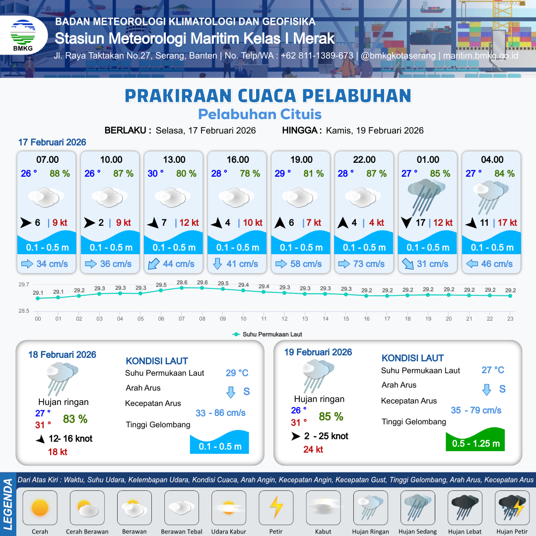 17 Feb 26, 02.00 15 jam yang lalu | Berawan Tebal | Barat 2 kt Gust Peningkatan kecepatan angin yang singkat dan tiba-tiba : 8 kt | | | 10 km | 26 °C | 89 % | +0.20 m |