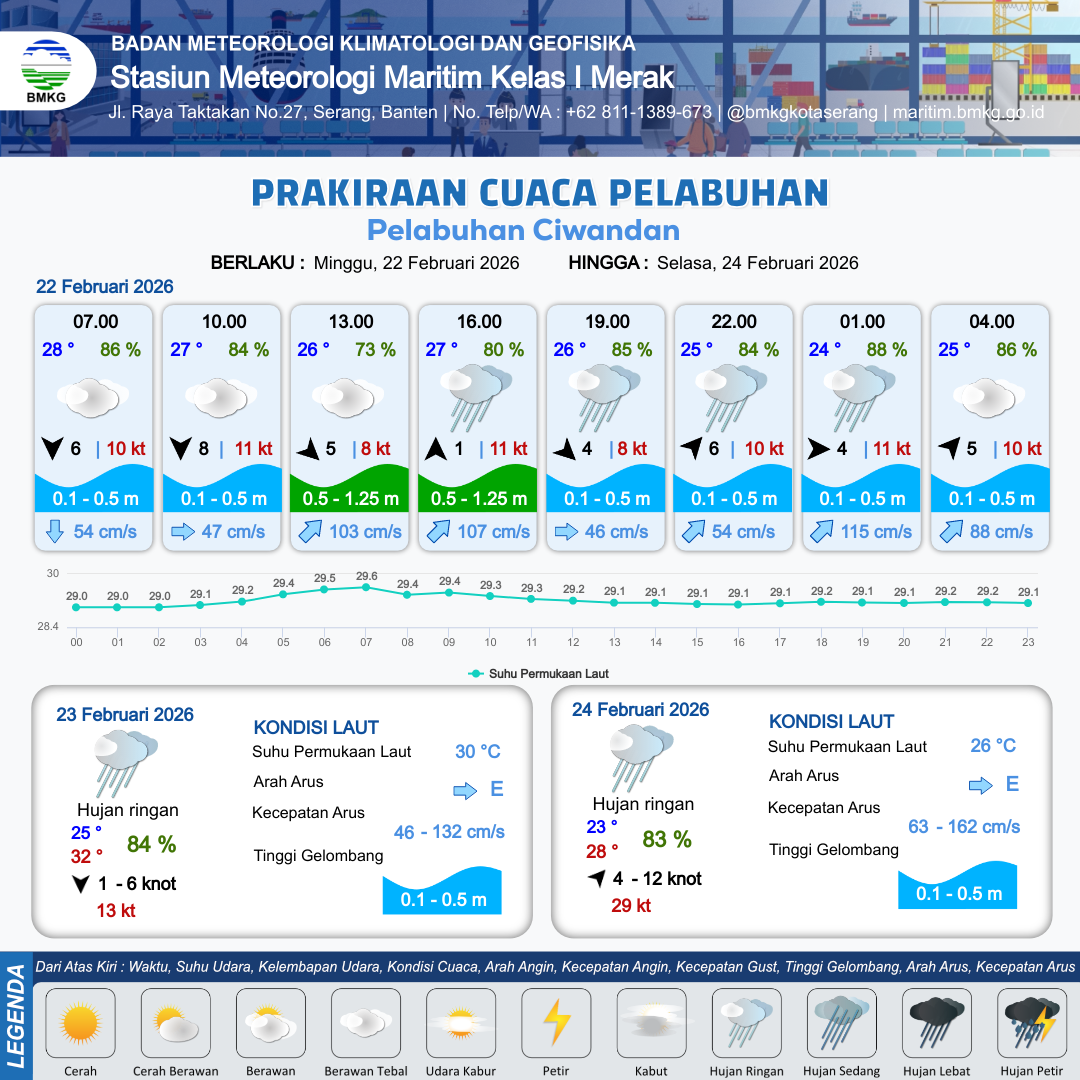 22 Feb 26, 22.00 4 jam kedepan | Berawan Tebal | Barat Daya 5 kt Gust Peningkatan kecepatan angin yang singkat dan tiba-tiba : 8 kt | | | 10 km | 25 °C | 86 % | -0.14 m |