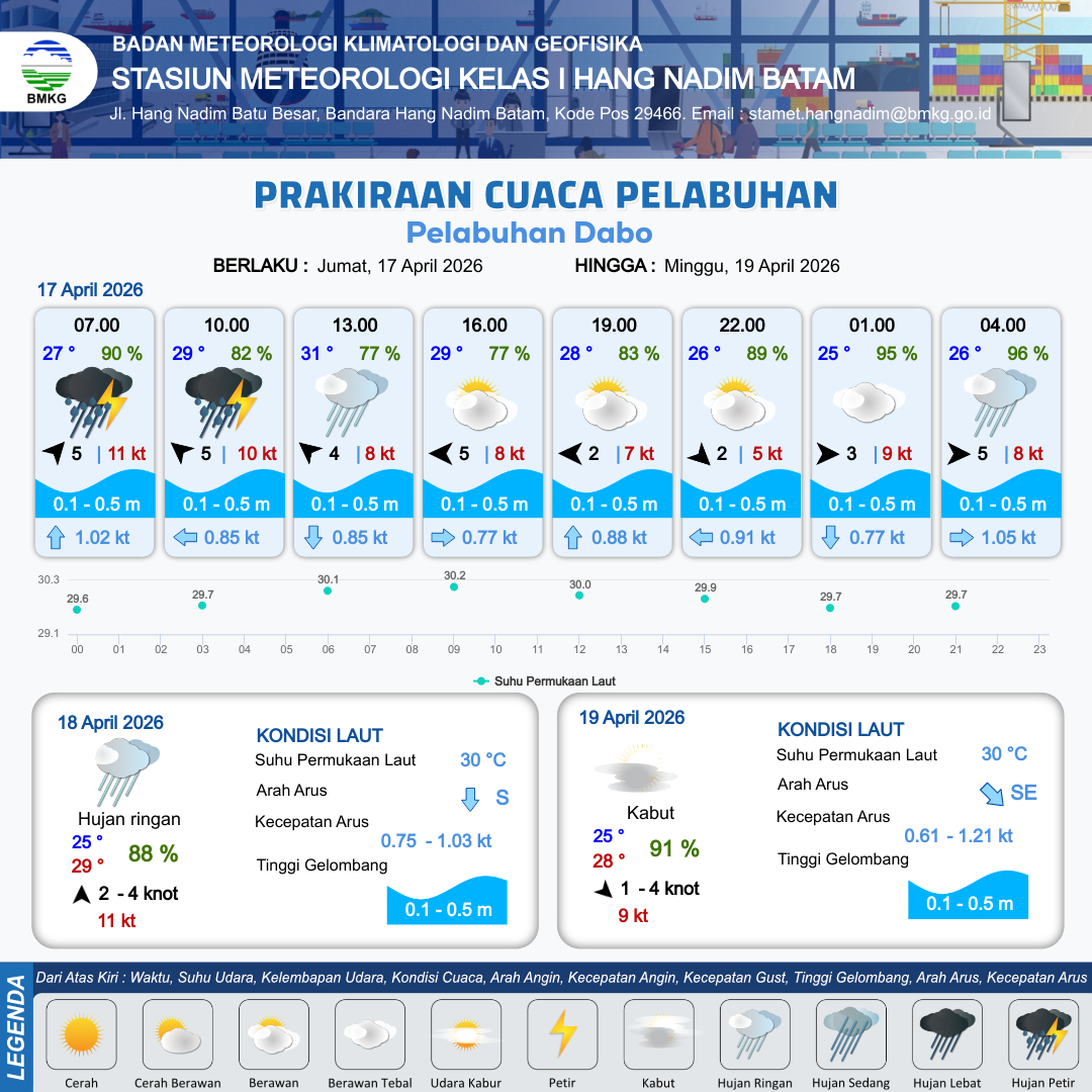 17 Apr 26, 10.00 7 jam yang lalu | Cerah Berawan | Timur 5 kt Gust Peningkatan kecepatan angin yang singkat dan tiba-tiba : 9 kt | | | 10 km | 29 °C | 79 % | +0.58 m |