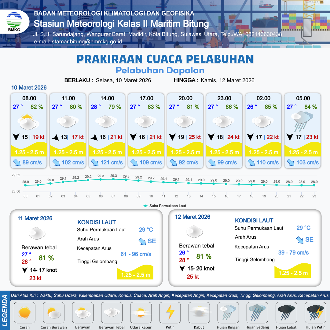 10 Mar 26, 09.00 5 jam kedepan | Utara 16 kt Gust Peningkatan kecepatan angin yang singkat dan tiba-tiba : 21 kt | 1.5 m Sedang | Tenggara 109.0 cm/s | 10 km | 27 °C | 83 % | -0.55 m | |