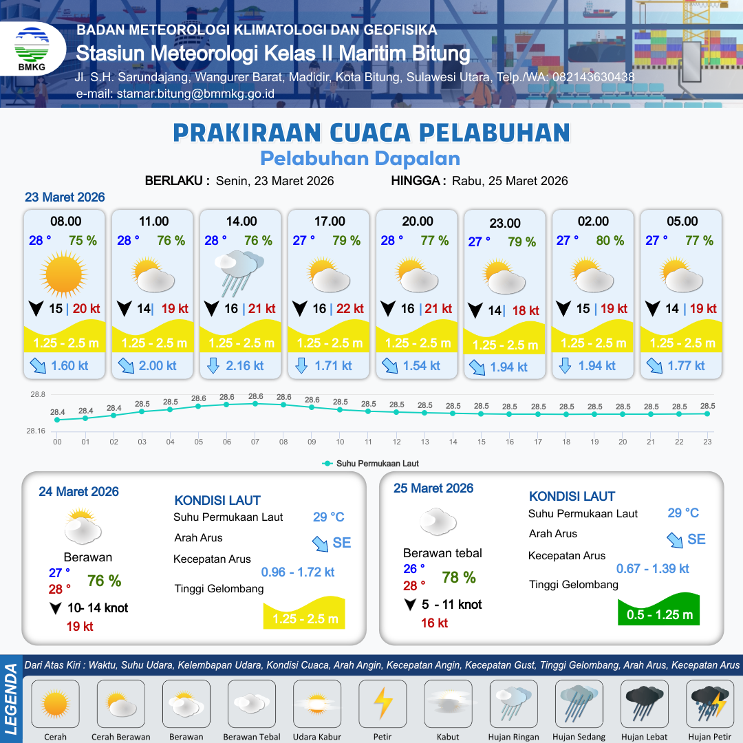 23 Mar 26, 23.00 17 jam kedepan | Utara 13 kt Gust Peningkatan kecepatan angin yang singkat dan tiba-tiba : 18 kt | 1.3 m Sedang | Tenggara 1.5 Knot | 10 km | 28 °C | 75 % | +0.34 m |