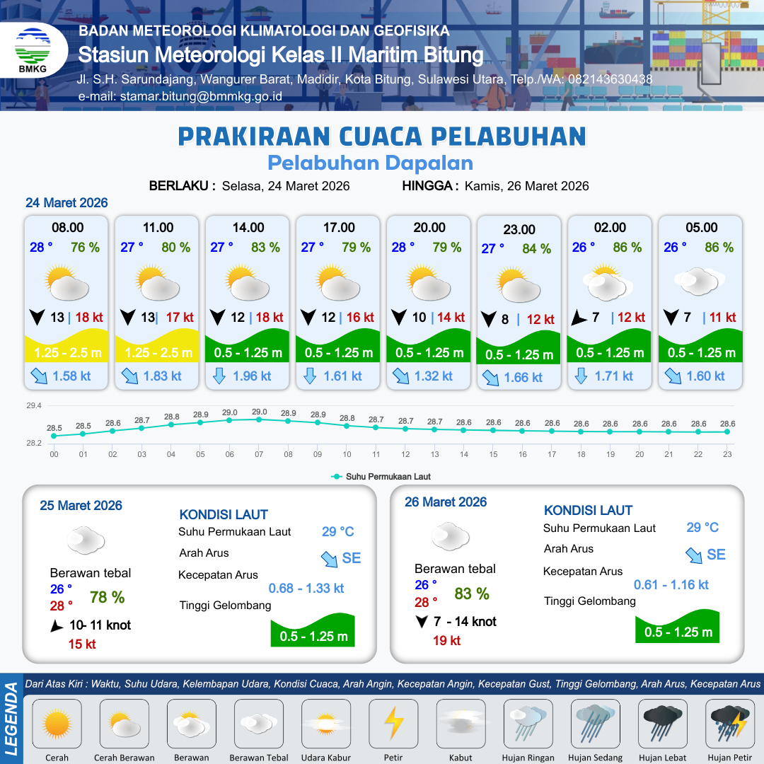 24 Mar 26, 15.00 3 jam kedepan | Utara 8 kt Gust Peningkatan kecepatan angin yang singkat dan tiba-tiba : 12 kt | 1.1 m Rendah | Tenggara 1.7 Knot | 10 km | 27 °C | 84 % | -0.01 m | |